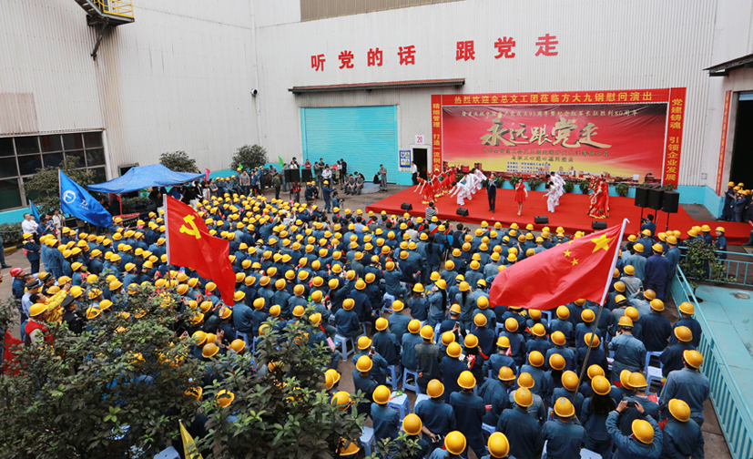為慶祝中國(guó)共產(chǎn)黨成立95周年暨紀(jì)念紅軍長(zhǎng)征勝利80周年,帶著對(duì)江西革命老區(qū)人民的厚愛(ài)與關(guān)懷,中華全國(guó)總工會(huì)文工團(tuán)(以下簡(jiǎn)稱(chēng)全總文工團(tuán))專(zhuān)程來(lái)到九江慰問(wèn)演出。10月20日下午,全總文工團(tuán)來(lái)到九江鋼鐵火熱的生產(chǎn)一線(xiàn),隆重舉行“永遠(yuǎn)跟黨走”與職工心連心慰問(wèn)演出,唱響了一曲中國(guó)夢(mèng)、勞動(dòng)美的贊歌。