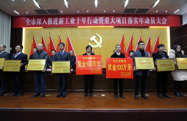 據(jù)了解,為貫徹落實(shí)中央全面建成小康社會(huì)的目標(biāo),進(jìn)一步推動(dòng)九江市經(jīng)濟(jì)發(fā)展,市委、市政府上下緊緊圍繞新工業(yè)開(kāi)展工作,堅(jiān)定不移主攻工業(yè),2016年打好“新工業(yè)十年行動(dòng)”第一戰(zhàn),進(jìn)行了一系列部署,提出了一系列措施和要求,對(duì)重點(diǎn)園區(qū)、企業(yè)制定了發(fā)展考核目標(biāo),強(qiáng)化舉措,扎實(shí)推進(jìn)。方大九鋼公司爭(zhēng)當(dāng)九江市工業(yè)戰(zhàn)線的排頭兵,2016年在以黃智華為首的領(lǐng)導(dǎo)班子帶領(lǐng)下,堅(jiān)定不移貫徹落實(shí)市委、市政府“新工業(yè)十年行動(dòng)”要求,高舉黨建為魂的企業(yè)文化大旗,緊緊圍繞全面完成“新工業(yè)發(fā)展考核目標(biāo)”這一工作任務(wù),帶領(lǐng)全體員工積極主動(dòng)投身生產(chǎn)經(jīng)營(yíng),深入推進(jìn)精細(xì)化管理,大力抓好降本增效,在科技創(chuàng)新、綠色發(fā)展、精細(xì)管理、企業(yè)轉(zhuǎn)型等各個(gè)方面都做出了示范,企業(yè)全年實(shí)現(xiàn)銷(xiāo)售收入119.39億元,實(shí)現(xiàn)利稅15.94億元、稅費(fèi)6.3億元,盈利創(chuàng)歷史新高,并在2016年7月份湖口縣高新產(chǎn)業(yè)技術(shù)園遭遇洪災(zāi)威脅時(shí)主動(dòng)開(kāi)渠泄洪,為九江市全年工業(yè)經(jīng)濟(jì)取得逆勢(shì)奮進(jìn)、保持平穩(wěn)較快發(fā)展、實(shí)現(xiàn)“十三五”起始之年良好開(kāi)局做出了突出貢獻(xiàn)。此次公司及公司主要領(lǐng)導(dǎo)獲得多個(gè)獎(jiǎng)項(xiàng),充分證明企業(yè)所做貢獻(xiàn)和所取成績(jī)受到了九江市委、市政府的高度肯定。